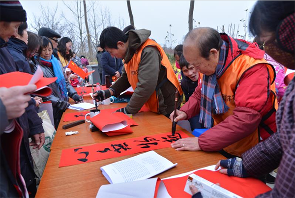 下午3時,場子一鋪開,書法愛好者們揮毫潑墨、筆走龍蛇,不一會兒,一幅幅珍貴的墨寶便誕生在紅彤彤的正丹紙上,一句句祝福的話語,寄托著職工居民對農歷新年的憧憬和向往。活動現場,前來領取春聯的職工居民三五成群,熱鬧非凡,其中,“春回大地,福滿人間”等大紅喜聯最受歡迎,不一會兒便被搶選一空。