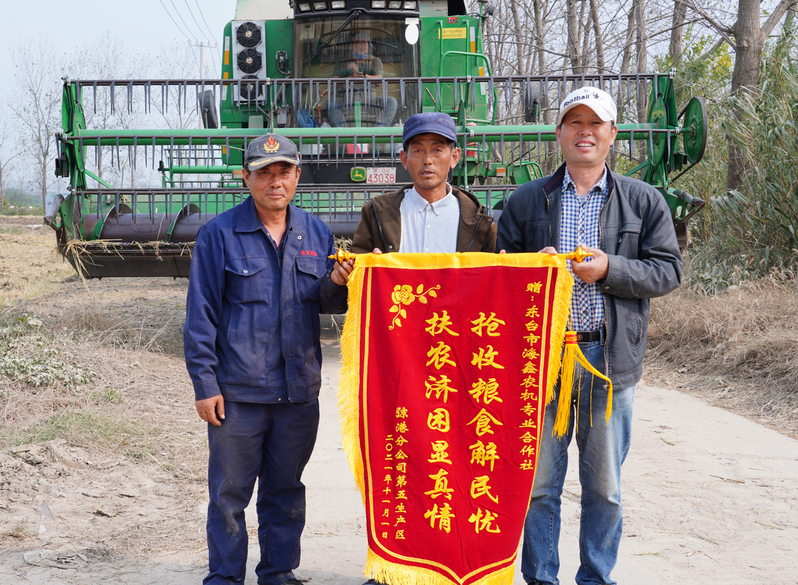 11月1日中午12點30分,收割車隊從弶港分公司第五產生區17連北匡19、20號田間駛出,生產區主任楊定貴臉上露出了笑容,4300多畝水稻秋收任務提前完成,為秋播、秋管打了良好基礎,他激動地拿出錦旗送到農友農機機駕人員手上,連聲感謝農友農機在生產區秋收緊急關頭及時出手救援,為生產區“三秋”工作爭得了主動權。