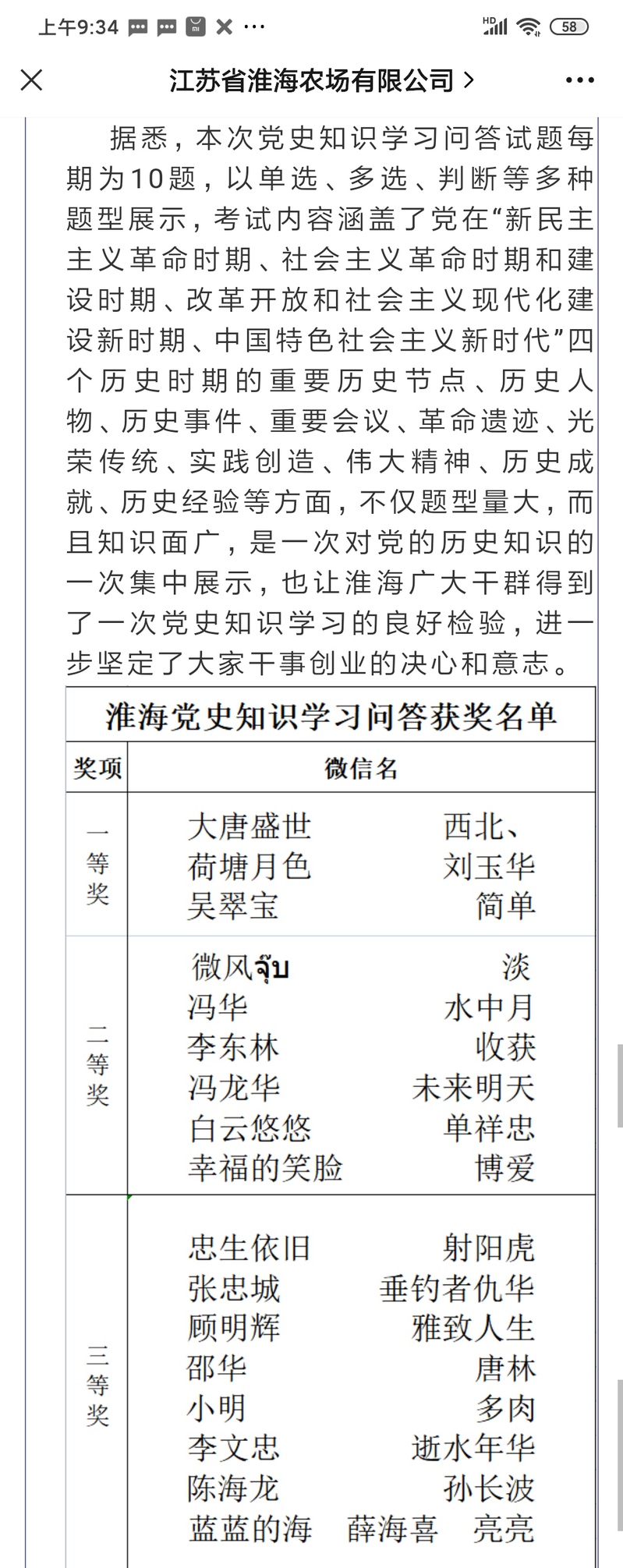 “作為農場老干部,我一直關注淮海農場的大事,這次為慶祝中國共產黨成立100周年大慶,農場黨委工作部去年6月1日通過微信公眾號發布的答題頁面進行答題活動時,我本著試試看的心理,第一次答題結束就獲得了100分,讓我的信心大增?!背潭ɑ陬I獎名單上簽上自己的名字后興趣盎然地說,“于是在接下來的每周黨史知識學習問答試題,我都是認真對待,直到推出了26期淮海黨史學習教育知識問答全部結束。”