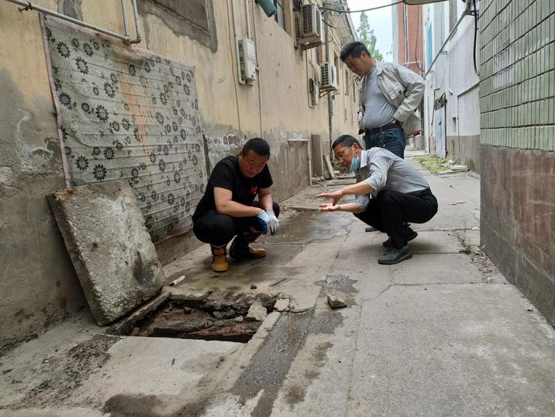 5月19日下午,新洋社區(qū)城西居委會黨支部書記蔡文良帶領(lǐng)黨員王強(qiáng)及居民組長一行在一號樓前面清理下水道。早在兩個多月前,一號樓就出現(xiàn)了下水管堵塞的現(xiàn)象,由于無人維修,堵塞問題日益嚴(yán)重,管道污水逐漸上漲,漫延到地面,妨礙了樓內(nèi)居民的進(jìn)出。