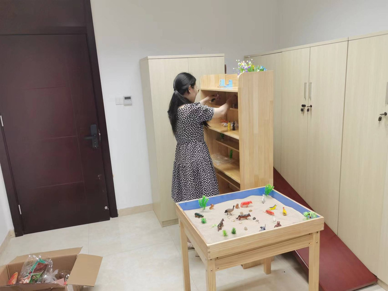 目前,淮海農場社區民政辦正緊鑼密鼓的建立服務流程和日常管理需要的各類制度,建立健全困境兒童臺賬和活動臺賬,預估10月底前,“淮海農場未成年人保護站”的各項設施完善配置,并正式開放。圖為社區民政辦工作人員正布置心理咨詢室設施。