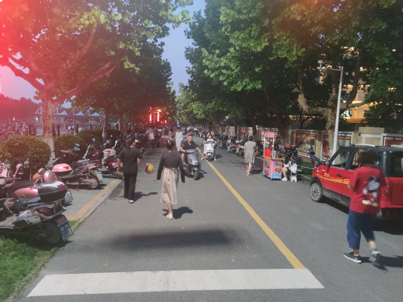 筆者站在廣場的門前看了一會兒后發現,盡管每天傍晚來這里健身的人流有上千人,創業路一旁的電瓶車、摩托車車位也十分緊張,但我注意到,許多駕著小轎車來的居民,將車停放在寬闊的淮海路一側的車位上,不盲目駛往創業路上有限的小車位,而大多數開著輕便車輛的居民,看到出入口旁兩側車子較多的情況下,也會去很遠的地方停車再跑回來,大家都能做到文明自覺,給他人方便,也是給自己方便。圖為有序停放的車輛。