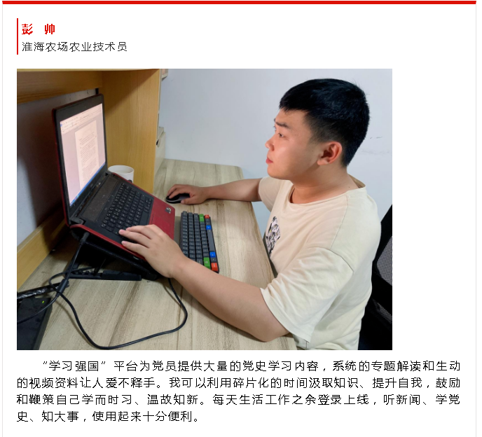 淮海各基層的黨員群眾堅持每天打卡答題,積分你追我趕,大家的學習積極性高漲,實現了從要我學我要學,從被動學主動學的轉變。通過答題活動,進一步加強了常態化制度化使用學習強國學習平臺,在互學互比中實現互進互促。圖為彭帥在射陽宣傳第8期上的學習感悟。