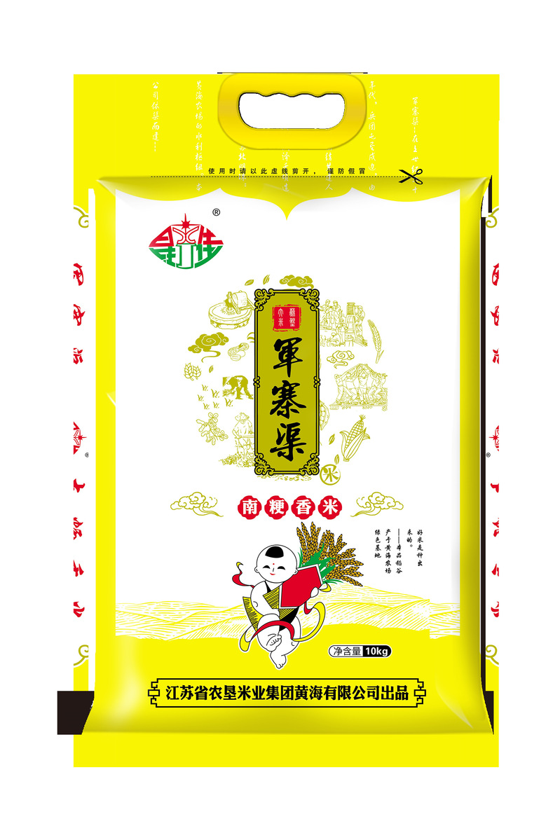 “軍寨渠”商標于2018年注冊,商品使用類別為第30、31類。圖案里的水果造型寓意“農(nóng)副產(chǎn)品”;“綠色”寓意與健康同伴相融,生生不息;“軍寨渠”是黃海農(nóng)場母親河,一直哺育著農(nóng)場遼闊的土地。上世紀60年代末開挖軍寨渠時,農(nóng)場職工和知青幾乎都參與到工程建設(shè)中,留下了關(guān)于軍寨渠建設(shè)的深刻記憶。以此為商標,也是紀念黃海這段“墾荒史”,傳承墾荒文化。