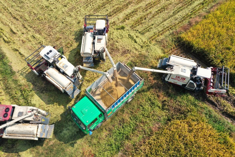 1017日,寶應(yīng)湖農(nóng)場5萬畝稻田開鐮試割。三四臺收割機(jī)來回穿梭、相互協(xié)作,粒粒飽滿的水稻收割脫粒,很快就被裝進(jìn)運(yùn)輸車?yán)铮S后運(yùn)送至場頭過磅晾曬。農(nóng)技人員穿梭在剛收割完畢的田塊里,根據(jù)收割機(jī)的實(shí)際收割質(zhì)量,進(jìn)行指揮調(diào)整,把“豐收在望”變成“豐收在手”。