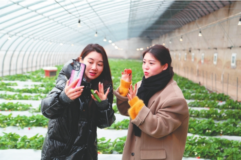 1月16日,江蘇省崗埠農場富民農業科技園溫室大棚內,工作人員正在抖音直播平臺向消費者推介園區的果蔬、花卉產品。通過開辟線上銷售“新賽道”,讓手機成為新“農具”,讓直播間成為新“柜臺”,拓寬農產品銷售渠道,帶動全場溫室大棚種植戶增收。