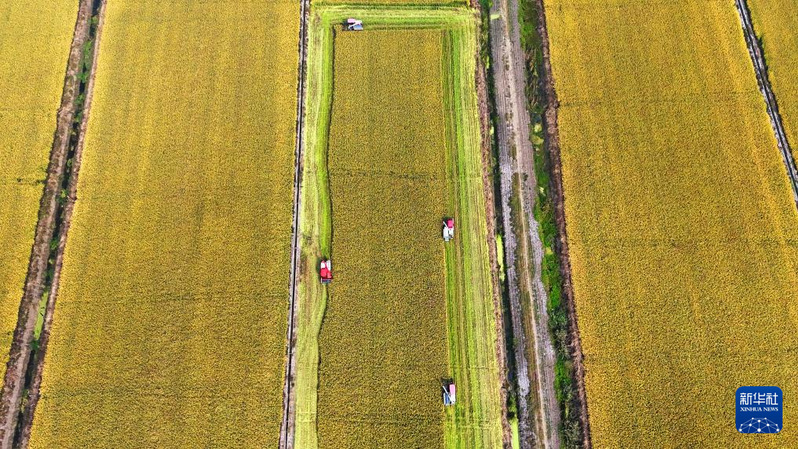 江蘇省連云港市海州區崗埠農場工作人員在搶收水稻(無人機照片)。新華社發(耿玉和 攝)