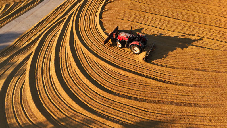 江蘇省連云港市海州區云臺農場工作人員搶抓晴好天氣翻曬稻谷(10月28日攝,無人機照片)?!靶轮瞿噻R面平,家家打稻趁霜晴?!苯鹎飼r節,各地迎來豐收季,農民抓住晴好天氣收割收獲晾曬谷類作物,田間地頭呈現一派忙碌的豐收景象。新華社發 耿玉和 攝