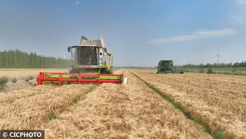 2025年5月20日,聯(lián)合收割機(jī)在位于江蘇省鹽城市射陽縣的江蘇農(nóng)墾新洋農(nóng)場大麥田里作業(yè)。CICPHOTO/張偉生 攝