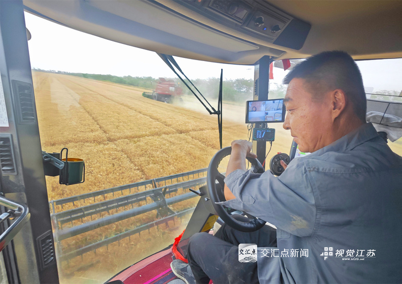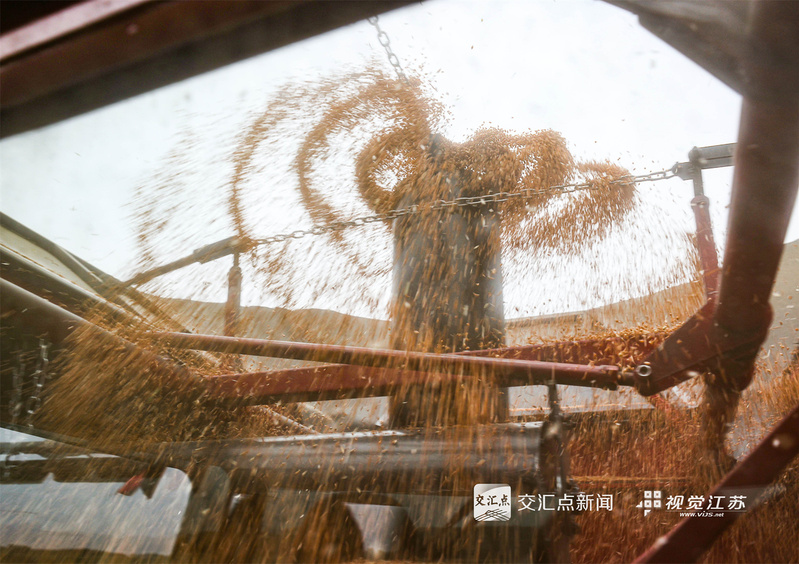 (特約攝影 許昌銀 錢厚紅 15:24攝 20:39上線)五月的麥田,金穗飄香。5月26日,淮安盱眙洪澤湖畔的江蘇農墾三河農場的3.82萬畝小麥開鐮收割。當地利用晴好天氣加緊收割,確保顆粒歸倉。
