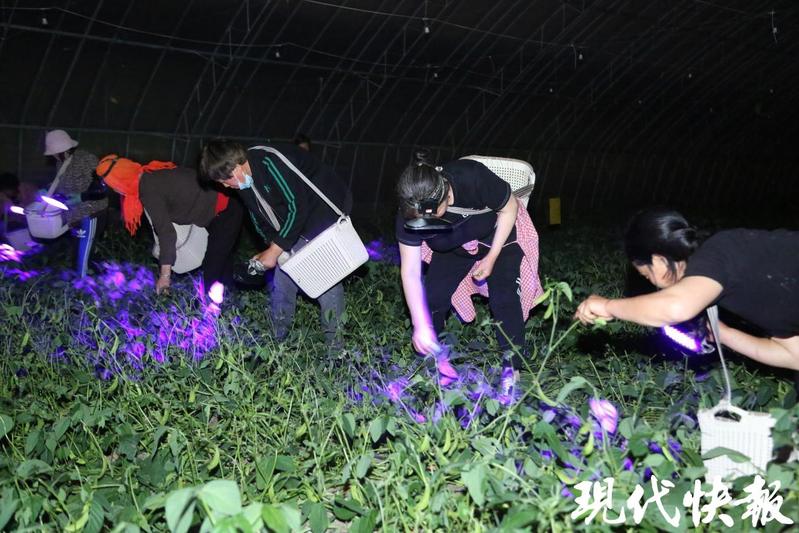 “搜尋時一定要仔細,左右兩邊都得留意,才能把豆丹抓全。”單體2號大棚的豆丹養(yǎng)殖負責人李加祥一邊熟練地捕捉豆丹,一邊向工作人員傳授經(jīng)驗,“豆丹和豆葉顏色相近,白天捕捉極易遺漏。但到了夜間,紫光燈一照,豆丹就像會發(fā)光的螢火蟲,清晰可見,不僅抓捕效率高,還能做到顆粒歸倉。”為確保此次捕捉行動順利開展,園區(qū)提前規(guī)劃,從人員調(diào)配到工具準備,每一個環(huán)節(jié)都精心部署,為高效捕捉打下堅實基礎(chǔ)。