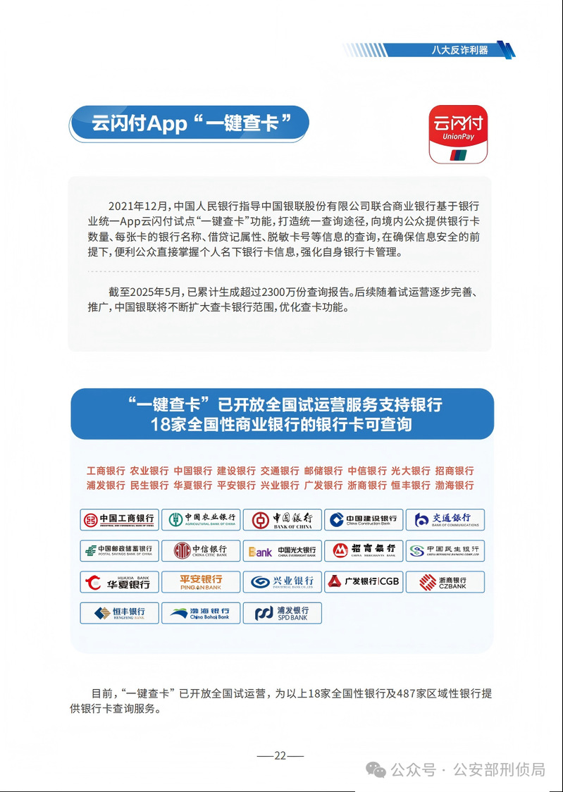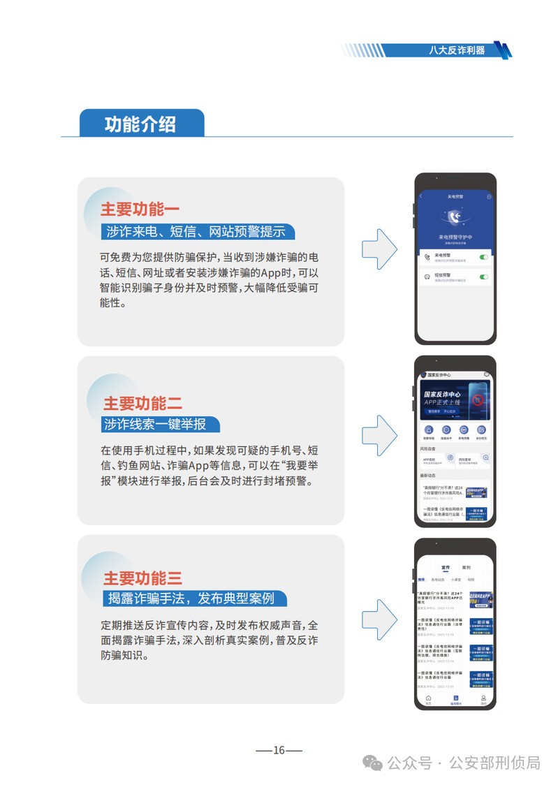 《手冊》詳細梳理了刷單返利、虛假網絡投資理財、虛假購物服務、冒充電商物流客服、貸款征信、冒充領導熟人、冒充公檢法、婚戀交友、網絡游戲產品虛假交易、機票退改簽等10類高發的電信網絡詐騙類型,通過典型案例剖析,逐個解析詐騙套路,揭批作案手法,為易受騙群體“量身定制”反詐防騙提示。同時,《手冊》詳細介紹了前期公安部會同工信部、中國人民銀行推出的七大反詐利器——國家反詐中心APP、96110預警勸阻專線、12381涉詐預警勸阻短信系統、全國移動電話卡“一證通查”、全國互聯網賬號“一證通查”、反詐名片、云閃付APP“一鍵查卡”,以及今年工信部推出的第八個反詐利器——跨境提醒服務,幫助群眾有效甄別境外來電。此外,《手冊》首次總結提煉了幫助群眾快速破譯騙局的20個防詐關鍵詞,切實構筑攔截電信網絡詐騙的“防火墻”。