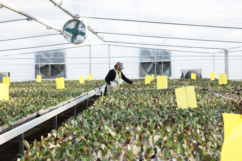 2月17日,云臺農場興墾科技員工在整理啤酒花藤蔓(上圖)。2月17日,云臺農場興墾科技工作人員在整理蝴蝶蘭育苗(下圖)。