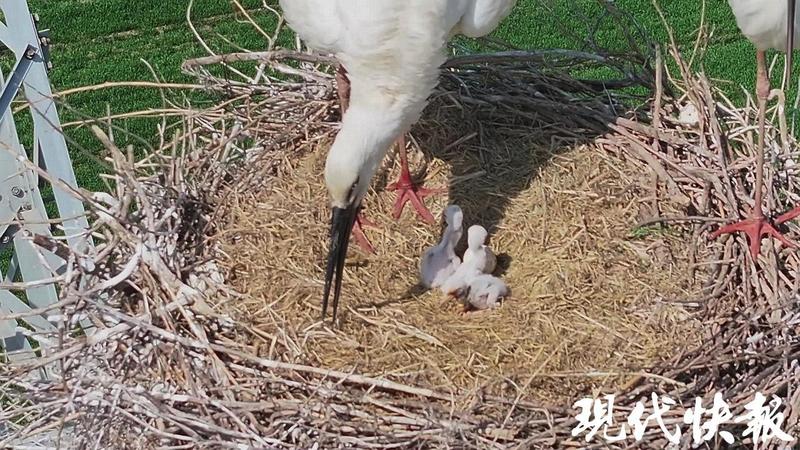 3月19日中午,江蘇農墾臨海農場員工宋婧通過一個多月的耐心蹲守和精心拍攝,成功用無人機航拍技術,全程記錄下國家一級保護野生動物東方白鸛從產蛋、孵化到三只“寶寶”孵化出殼的全過程。