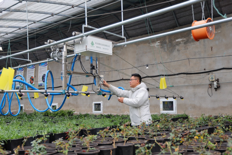 在崗埠農(nóng)場,技術(shù)員正通過自動化噴淋系統(tǒng)、智能溫控系統(tǒng)及實時監(jiān)測終端,對科技育苗大棚里的盆栽花苗進(jìn)行全面春季管護(hù),只需通過指尖的遠(yuǎn)程操作,通風(fēng)、控溫、噴淋等作業(yè)輕松完成。