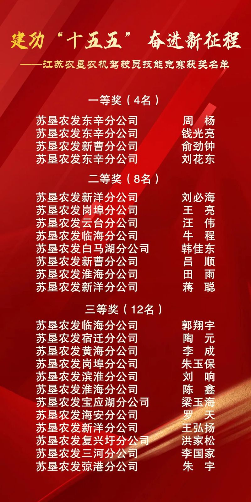 經過激烈角逐,東辛分公司周楊等4人榮獲一等獎,新洋分公司劉必海等8人榮獲二等獎,臨海分公司郭翔宇等12人榮獲三等獎。獲獎選手將按相關規定申報農機駕駛操作員職業資格等級認定,其中一等獎選手可申報高級工資格。