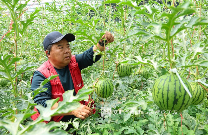 4月17日,連云港云臺(tái)農(nóng)場(chǎng)云水灣設(shè)施大棚內(nèi),工作人員正在管護(hù)吊蔓生長(zhǎng)的“小糖丸”西瓜。該品種顏值高、口感好,吊蔓種植提高了密度與產(chǎn)值,預(yù)計(jì)4月下旬至5月上旬上市。朱倩 攝 視覺(jué)江蘇網(wǎng)供圖