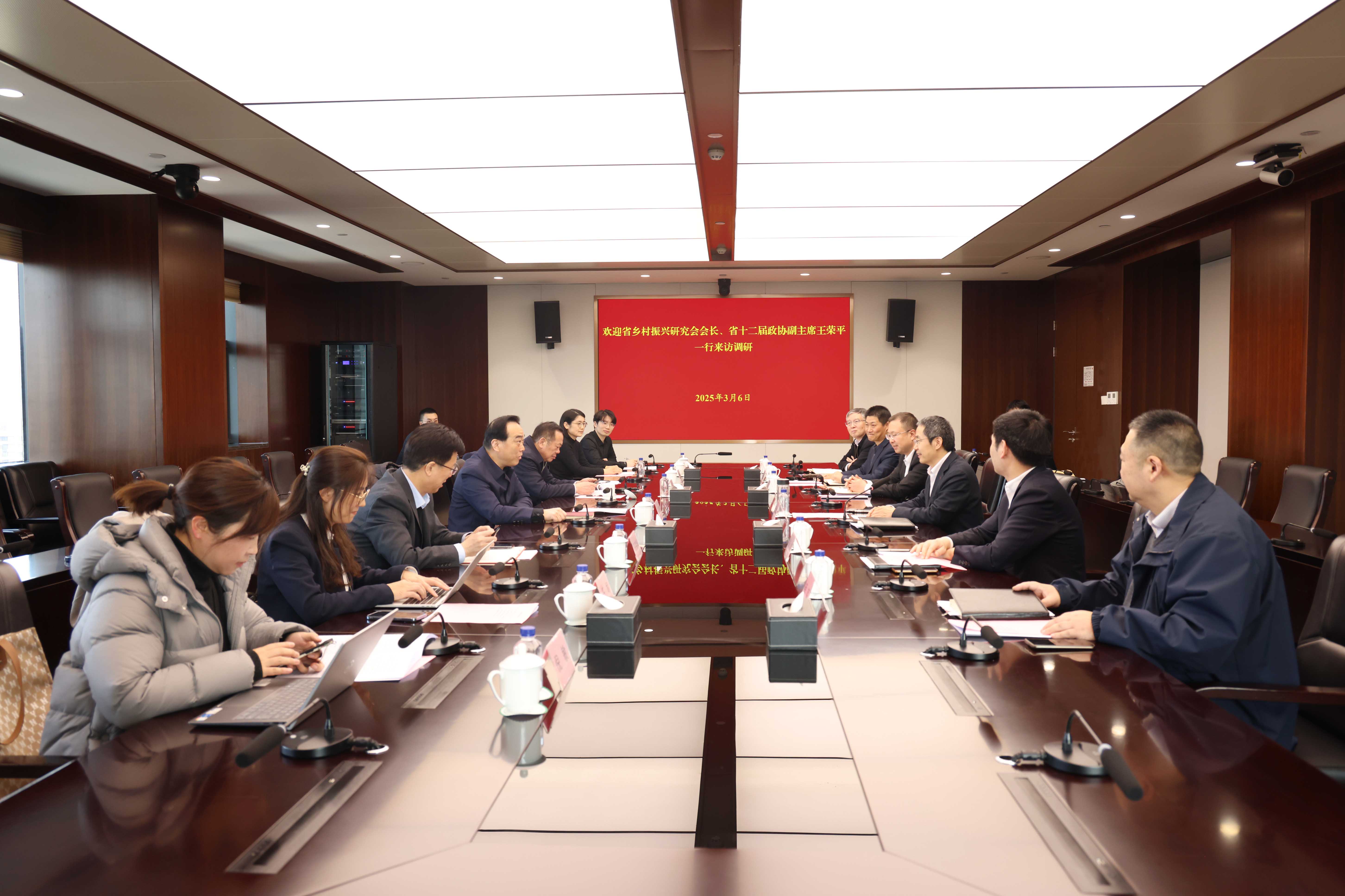 3月6日,江蘇省鄉村振興研究會會長、省十二屆政協副主席王榮平一行到集團公司調研。省鄉村振興研究會常務副會長、省政協農業農村委員會主任楊時云,省鄉村振興研究會副會長、省農科院黨委書記、副院長王克華,省鄉村振興研究會秘書長蘇慧軍等參加調研。集團黨委書記、董事長吳本輝,黨委副書記朱浩,黨委委員丁濤陪同調研。王榮平一行來到蘇墾尚膳門店,了解江蘇農墾糧油產品和精深加工食品,調研科技創新、智慧農業、農產品全程質量追溯等工作情況;在江蘇農墾展示廳,詳細了解農墾創業及改革發展歷程。座談會上,吳本輝介紹了集團公司產業發展情況、戰略路徑和鄉村振興實踐。他說,農墾是在特定條件下為承擔國家使命而建立的,在不同歷史時期出色履行了職責使命、完成了戰略任務,是全面推進鄉村振興、加快建設農業強國的重要戰略力量。江蘇農墾積極響應國家鄉村振興戰略,憑借自身資源與產業優勢,在保障糧食安全、促進種業振興、培育龍頭企業、發展智慧農業、聯農支農為農等方面取得顯著成效。希望在省鄉村振興研究會的指導和支持下,進一步深化政策研究、智慧農業、項目投資、典型經驗推廣等方面的對接合作,為現代農業高質量發展和鄉村振興增勢賦能。王榮平充分肯定了