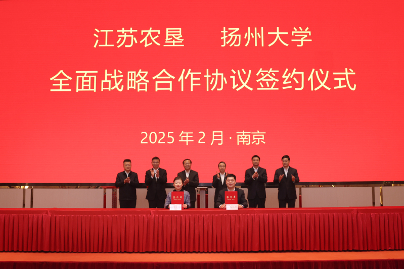 2月25日下午,省農墾集團與揚州大學全面戰略合作協議簽約儀式在南京舉行。集團黨委書記、董事長吳本輝致辭,揚州大學黨委書記丁建寧出席并講話。集團黨委副書記、總經理姜建友,黨委副書記朱浩出席簽約儀式,黨委委員、副總經理王立新主持簽約儀式。揚州大學黨委副書記、校長劉巧泉,黨委常委、副校長趙文明,黨委常委、副校長蔡穎蔚出席簽約儀式。吳本輝對丁建寧一行的到來表示熱烈歡迎,他表示,揚州大學以農學為傳統特色,在江蘇現代農業科技創新、科技服務、人才引培、對外合作等方面發揮重要作用,在時代浪潮中勇立潮頭,被譽為“高校改革的一面旗幟”。近年來,雙方在作物育種與栽培、農業水利與農機裝備、動物遺傳育種與繁殖、動物疫病防控、園藝與植物保護、農產品安全與環境等領域開展緊密合作,共同實施重點農業科研項目,深度開展人才交流,成果豐碩,充分彰顯了產學研合作的深厚根基和巨大潛力。江蘇農墾將以此次全面戰略合作為契機,共同構建科技研發、人才培養、示范應用“三位一體”的開放式平臺。深化科技創新合作,共建高水平技術研發與成果轉化基地,針對農業領域的關鍵核心技術,開展聯合攻關。強化人才培養合作,共建人才實習基地,推進柔性人才互聘機