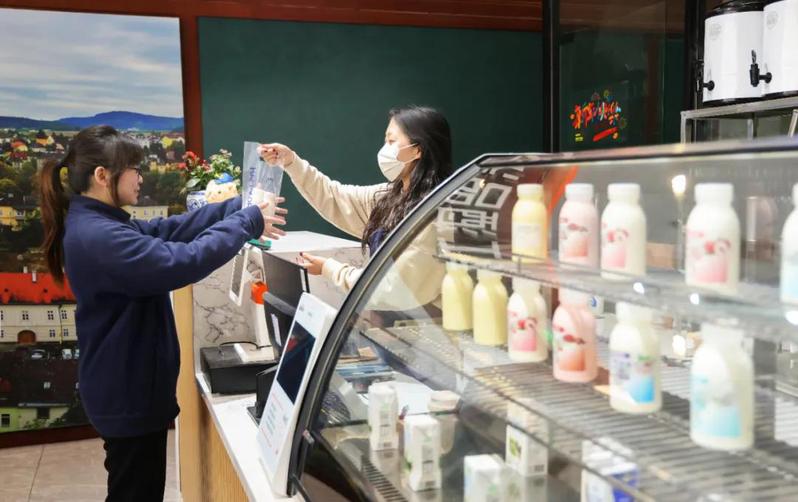 近日,位于蘇墾大廈的“簡蘇鮮奶吧”內格外熱鬧。現釀酸奶、冰激凌、拿鐵咖啡等產品一經上架,便吸引不少顧客前來品嘗購買。