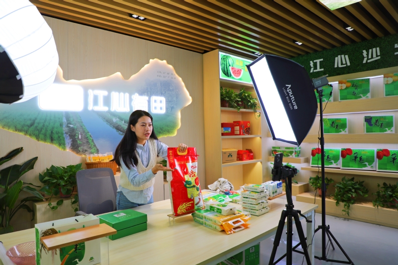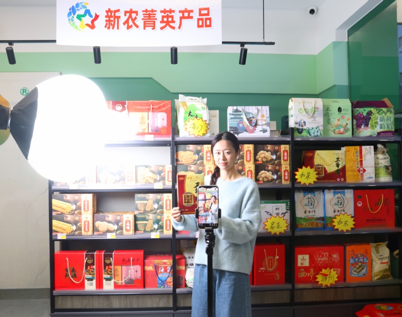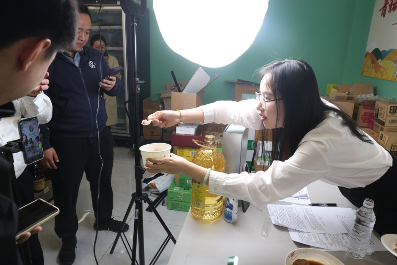 蘇墾南通公司積極與南通團(tuán)市委合作,在銷售門店開辟“新農(nóng)菁英產(chǎn)品”專區(qū),匯聚南通各縣市區(qū)的地方特色優(yōu)質(zhì)農(nóng)產(chǎn)品,豐富周邊居民的購買選擇。圖為公司青年員工借助抖音直播推廣帶動(dòng)產(chǎn)品銷售,拓寬增收渠道。