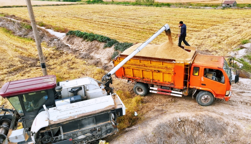 眼下正是秋收季節,蘇墾農發南通分公司萬頃良田外拓基地3000余畝大豆和節水抗旱稻迎來收獲期,一臺臺收割機開足馬力來回穿梭作業,機械收割、秸稈粉碎、裝車運輸等工序有條不紊地進行。“斷斷續續的雨水太影響秋收了,天氣預報顯示下周又是降雨天氣,我們趁著這兩天天氣好,白天、晚上連續作業把這片旱稻收完。”萬頃良田竹東村隊長張亞介紹道。蘇墾農發南通分公司把應對連續陰雨、做好搶收搶種作為當前的緊迫任務,積極協調收割機、農機手以及烘儲設備,利用降雨前的晴好天氣搶收已成熟作物,確保顆粒歸倉。據了解,今年南通分公司針對萬頃良田外拓基地實際,調優作物結構,首次種植節水抗旱稻品種,嚴格按照“綠色雙減”要求,立足降本增效,抓實田間管理,保障豐產豐收。大豆和旱稻的收割在10月13日全部結束,接下來,分公司將利用晴好天氣抓緊水稻搶收騰茬、適期播種,圍繞“收種管銷”各個環節打好“三秋”生產主動仗。