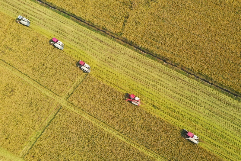 10月5日,大、小型號的收割機馳騁在蘇墾農發東辛分公司的玉米大豆帶狀復合種植田中,搶收成熟的玉米大豆。據悉,今年“三秋”時節,江蘇農墾已準備好大、小型號收割機2269臺保障收割工作。近年來,江蘇農墾大力推進農業機械化、智能化,主要農作物耕、種、收綜合機械化率超98%,每萬畝農田農機裝備動力達到發達國家水平。