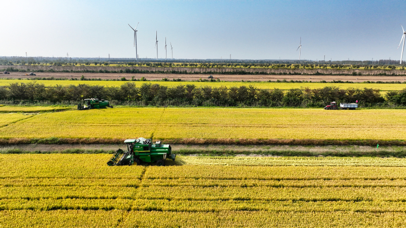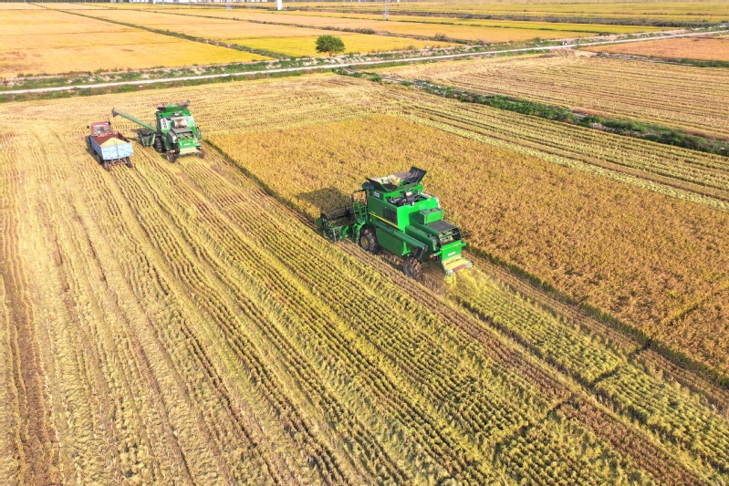 “開鐮了!豐收了!”10月17日上午10時,一臺臺聯合收割機駛向蘇墾農發新洋分公司新北生產區5大隊,金黃的水稻被大型機械收入“囊”中,新洋5.3萬畝水稻機收作業正式拉開序幕。今年“三秋”是集團公司第二次黨代會勝利召開后的第一個農忙,做好“三秋”工作意義重大,黨委班子成員靠前指揮,深入田間查看水稻收割情況。稻田接連成片,稻穗迎風擺動,收割機馬力全開、縱橫馳騁,收割、脫粒、裝車……一氣呵成,一派豐收的喜人景象。收割現場,蘇墾農發新洋分公司嚴格收割質量監督,把機械減損作為糧食增產的重點,加大收割質量檢查力度,減少收割損失,實現秋糧顆粒歸倉?!拔覀兠芮嘘P注天氣情況和水稻成熟度,統籌安排,堅持質量第一,進度第二,努力做到成熟一塊收割一塊,穩步推進收割進度。”農業中心負責人介紹。蘇墾農發新洋分公司立足“前期‘揀’收、中期‘穩’收、后期‘搶’收”的原則,充分利用秋收早期溫度高,有利晾曬、烘干的條件,適時收、曬、烘,為秋播及時騰茬,確保11月6日前完成秋播田塊收割任務。面對不穩定天氣因素,蘇墾農發新洋分公司強化機械保障,本部準備收割機58臺套,運糧車53臺,另調度好26臺小型履帶式收割機,隨時應對突發